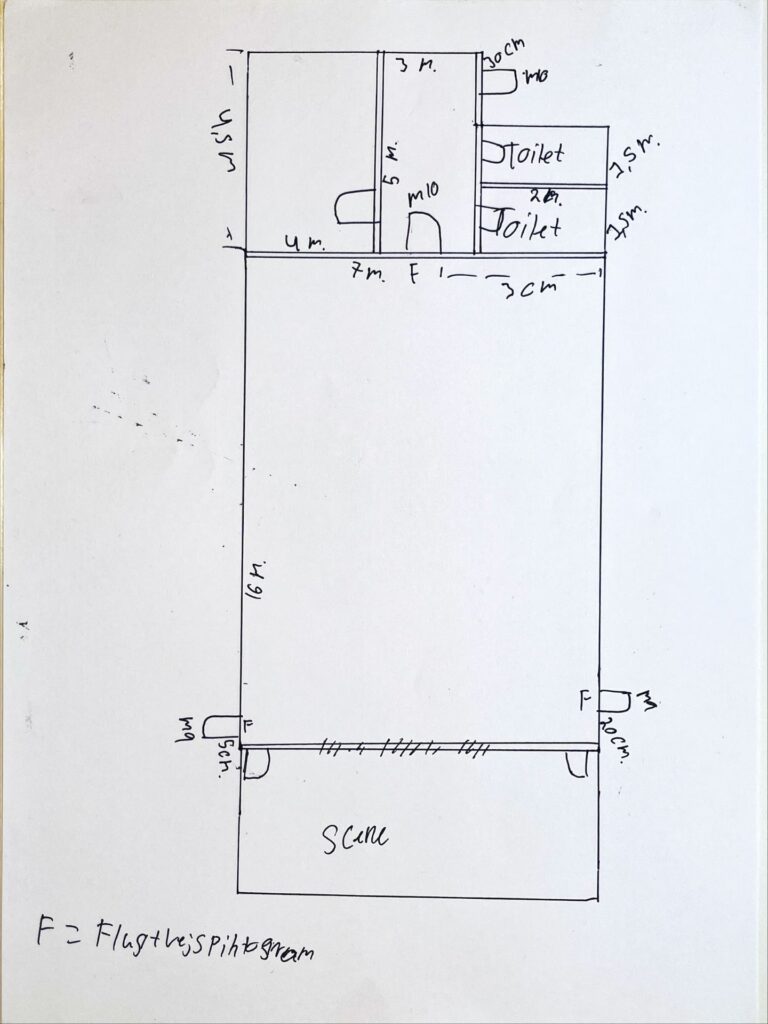 - Indvendigt bredde og længde af forsamlingslokalet og evt. omkringlæggende lokaler.
